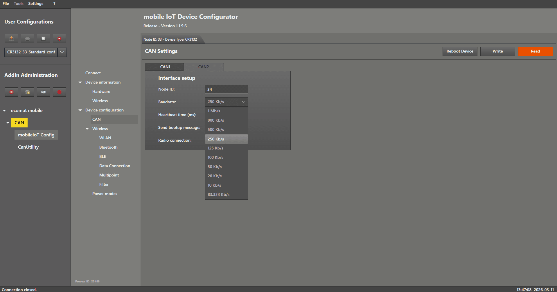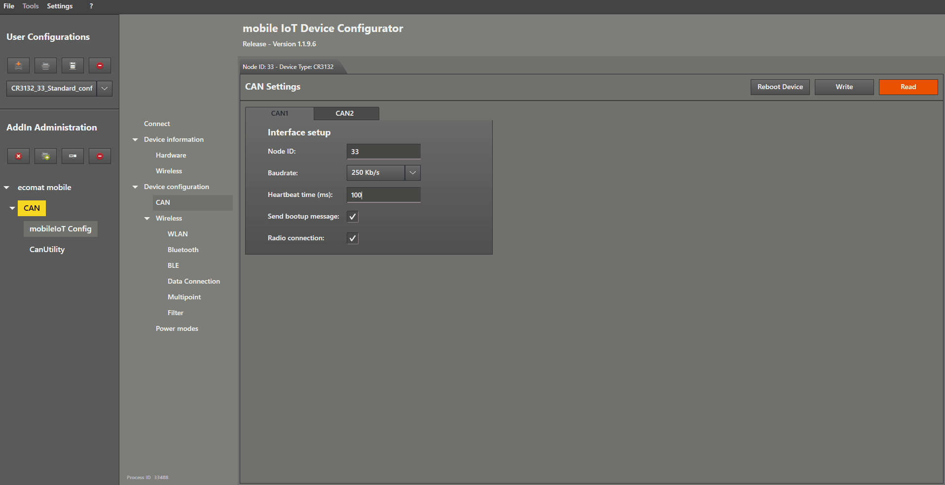 To enter the CAN settings of the CANwireless, left mouse click on “ CAN ” in the menu.