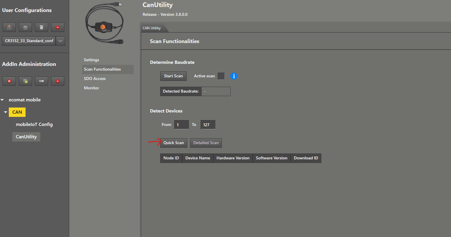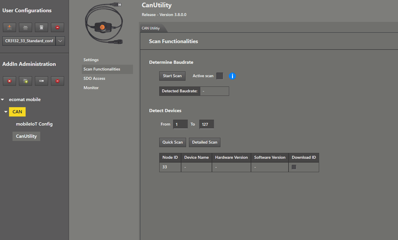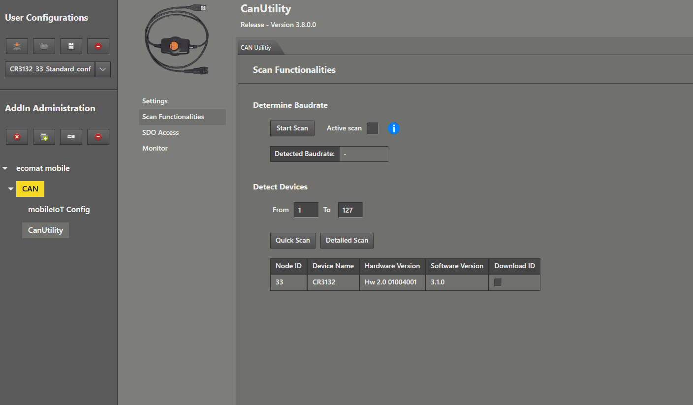 Find and Connect This guide explains how to locate your CANwireless device when it is using the default settings. First step: Check your wiring. Open the MaintenanceTool and load the standard configuration from the first guide. Left mouse click on “ CanUtility ”. In the submenu, choose “ Scan Functionalities ” by clicking with the left mouse button. As the last step, left mouse click on “ Quick Scan ”. After a few seconds, a NodeID should appear in the list. Now we perform a “ Detailed Scan ” by left mouse clicking on it to get further information about the device. Now we are sure that it is our CANwireless (CR3132). We also received additional information about the hardware version and software version . Now we can move on to connect to the device by left mouse clicking on the menu item “ mobileIoT Config ”. We now enter the NodeID of the device we found into the “ Node ID ” text field and left mouse click on “ Connect ”. When the device name and serial number are displayed in the add‑in, the CANwireless is responding and we can begin the configuration. Left mouse click on " Hardware " in the menu to see the most relevant information for you if you have a support request. Now you can proceed to the next guides.