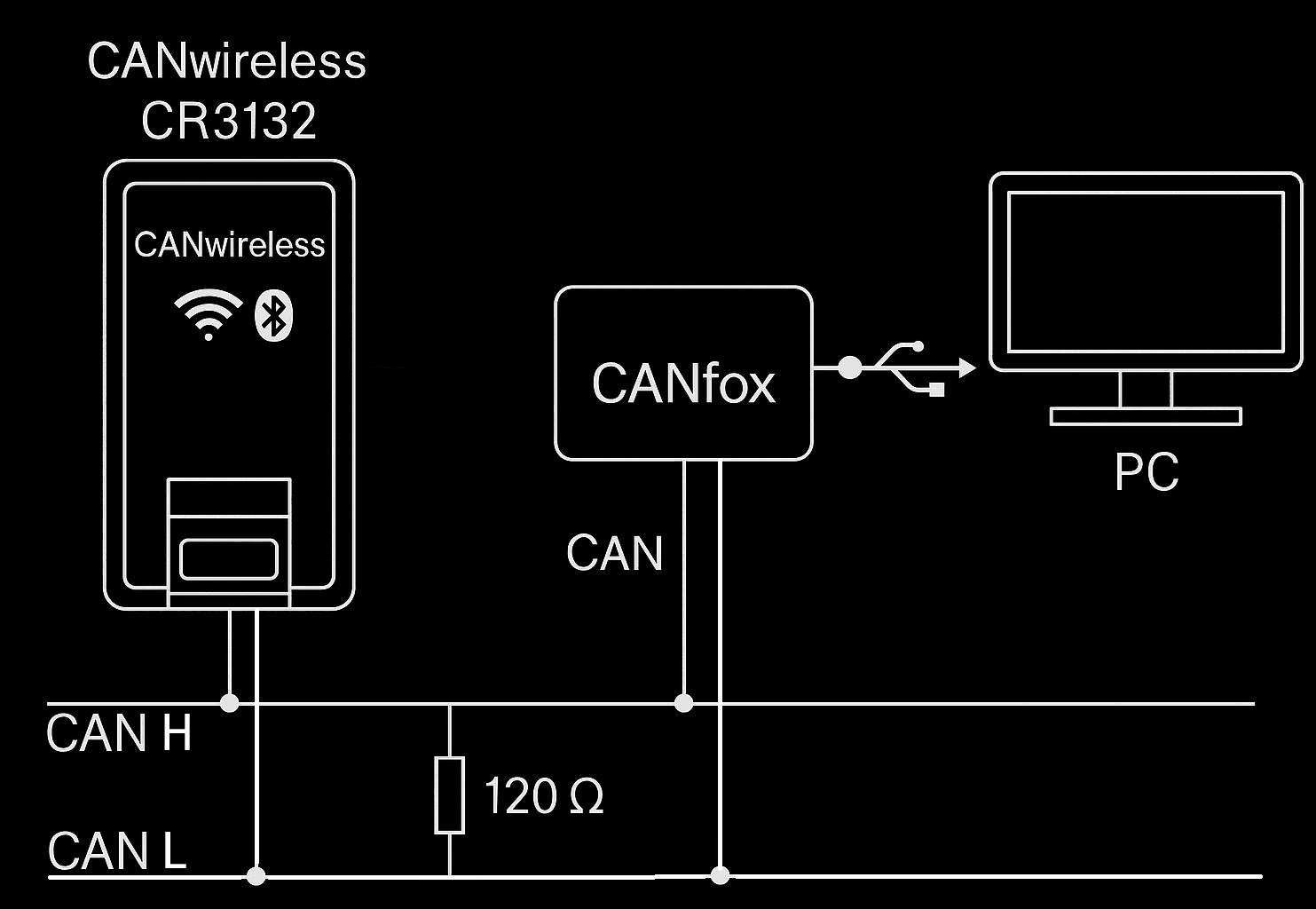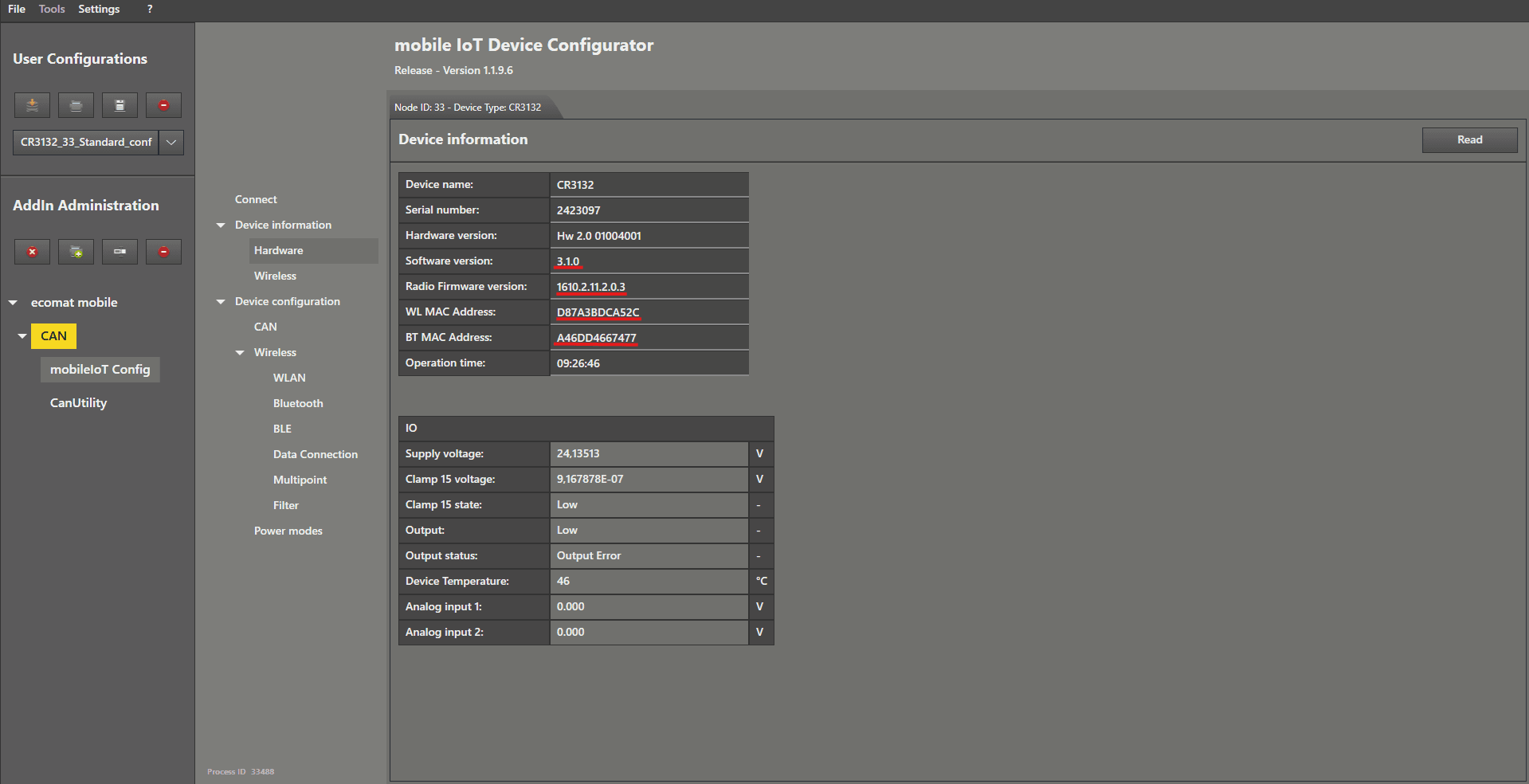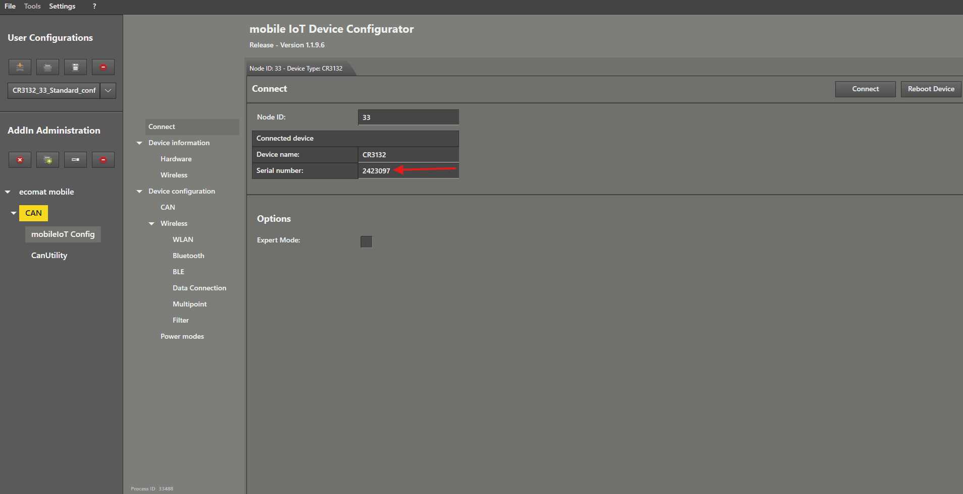 Find and Connect This guide explains how to locate your CANwireless device when it is using the default settings. First step: Check your wiring. Open the MaintenanceTool and load the standard configuration from the first guide. Left mouse click on “ CanUtility ”. In the submenu, choose “ Scan Functionalities ” by clicking with the left mouse button. As the last step, left mouse click on “ Quick Scan ”. After a few seconds, a NodeID should appear in the list. Now we perform a “ Detailed Scan ” by left mouse clicking on it to get further information about the device. Now we are sure that it is our CANwireless (CR3132). We also received additional information about the hardware version and software version . Now we can move on to connect to the device by left mouse clicking on the menu item “ mobileIoT Config ”. We now enter the NodeID of the device we found into the “ Node ID ” text field and left mouse click on “ Connect ”. When the device name and serial number are displayed in the add‑in, the CANwireless is responding and we can begin the configuration. Left mouse click on " Hardware " in the menu to see the most relevant information for you if you have a support request. Now you can proceed to the next guides.