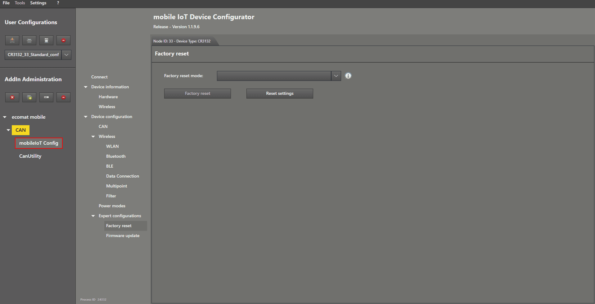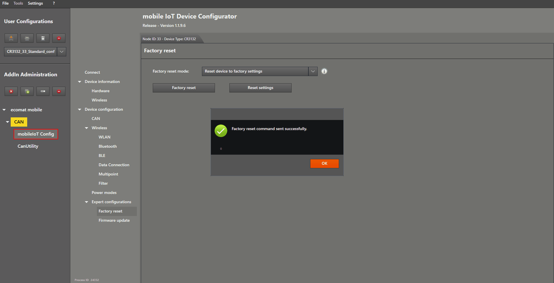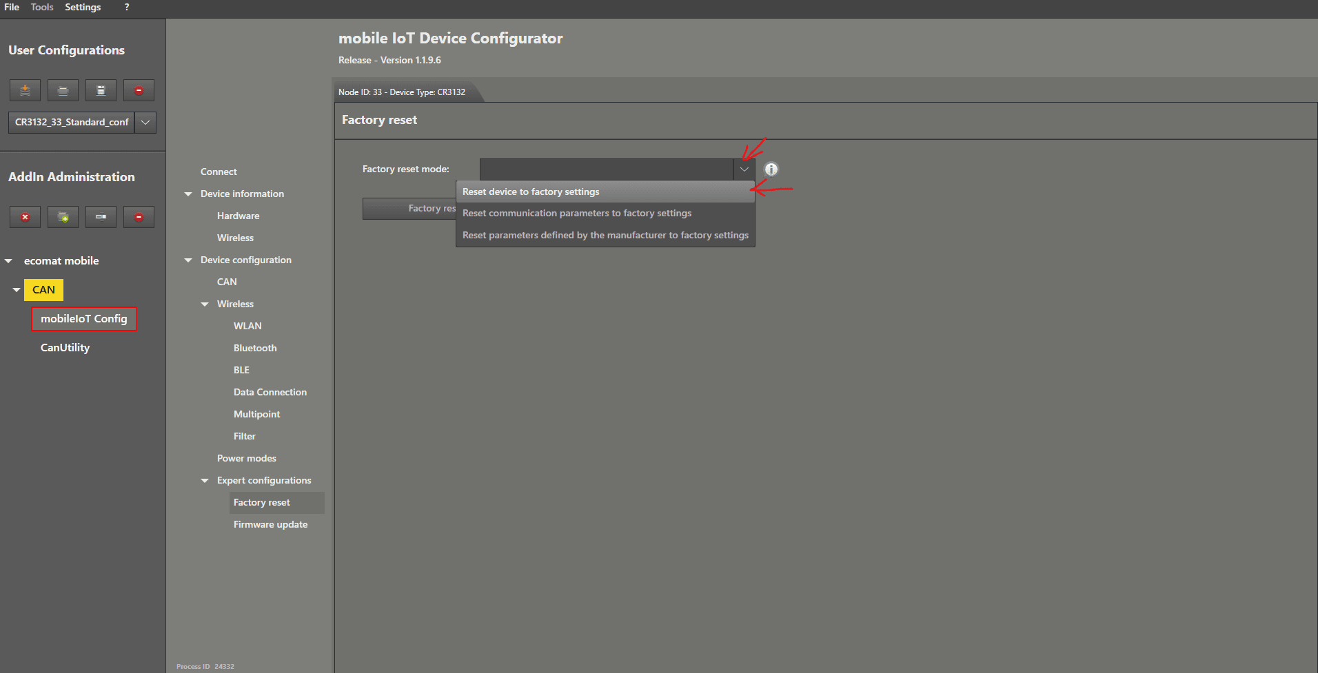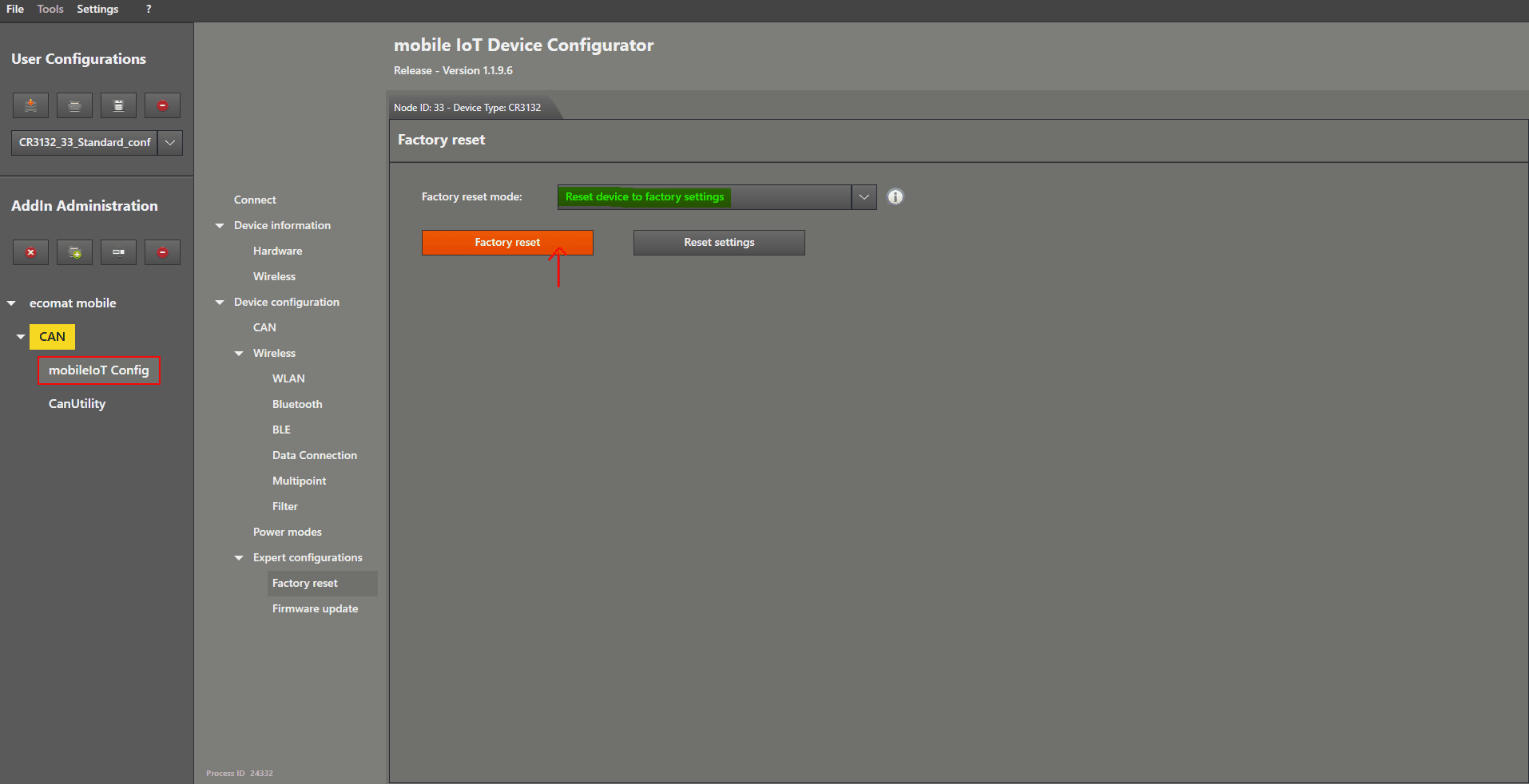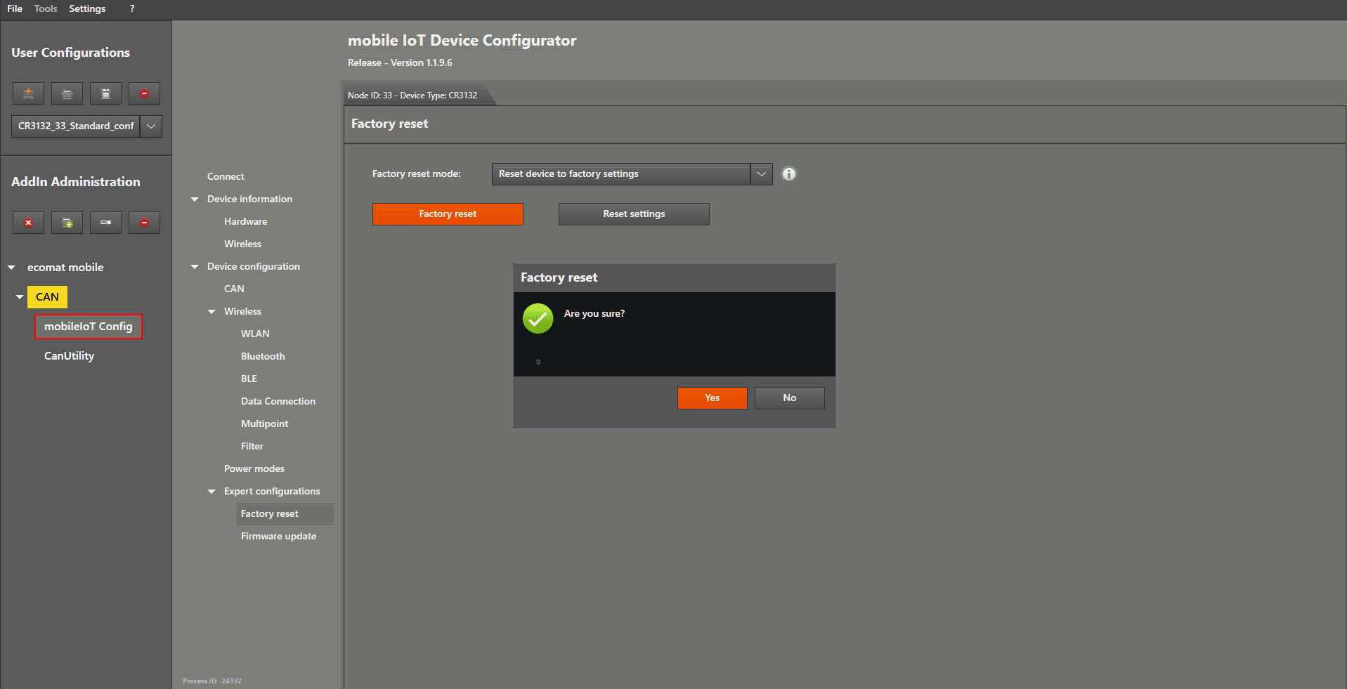 Factory Reset This guide is how to perform a factory reset Start by connecting the device. After you have connected the device properly, enable “Expert Mode” by ticking the checkbox. Now there are additional options available in the menu. Left mouse click on “ Factory reset ” to open the settings. Now we choose the reset type in the device by left mouse clicking on the dropdown menu on the right‑hand side of “ Factory reset mode ”. Select “ Reset device to factory settings ”. Left mouse click on the “Factory reset” button. A window will pop up asking if you are sure. Click “ Yes ” to continue. Your device is now back to factory settings.