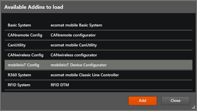 Left mouse click on “ mobileIoT Config ”, then left mouse click on “ Add ”.