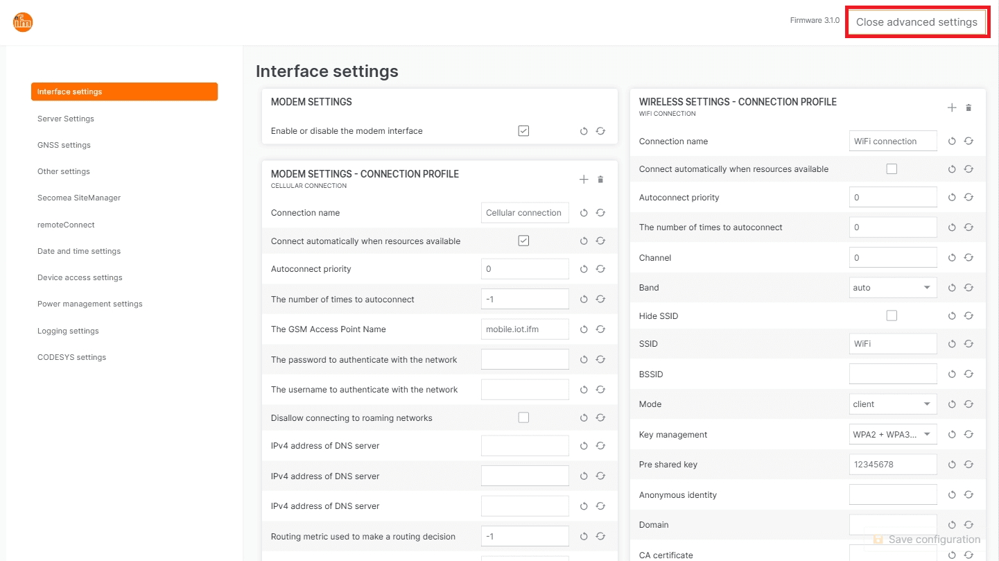 Server settings GNSS settings Other settings Secomea SiteManager Date and time settings Device access settings Power management settings CODESYS settings