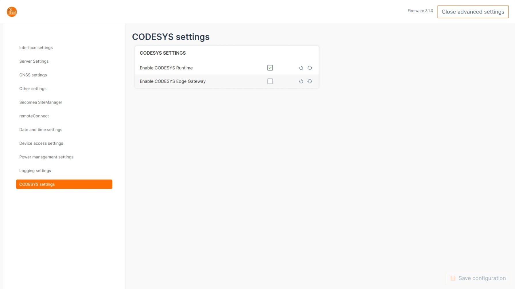 CODESYS settings In the Advanced Settings of the CR3171, you can modify the CODESYS settings to enable or disable different functionalities. ℹ Information: These settings are available with FW 3.1.0. Enable CODESYS Runtime Default: off Description: Enable / Disable the CODESYS Runtime. If enabled, you can login using CODESYS to download an application to the CR3171. Enable CODESYS Edge Gateway Default: off Description: Enable / Disable the CODESYS Edge Gateway. If enabled, you can find other devices using CODESYS, when connected via remote access.