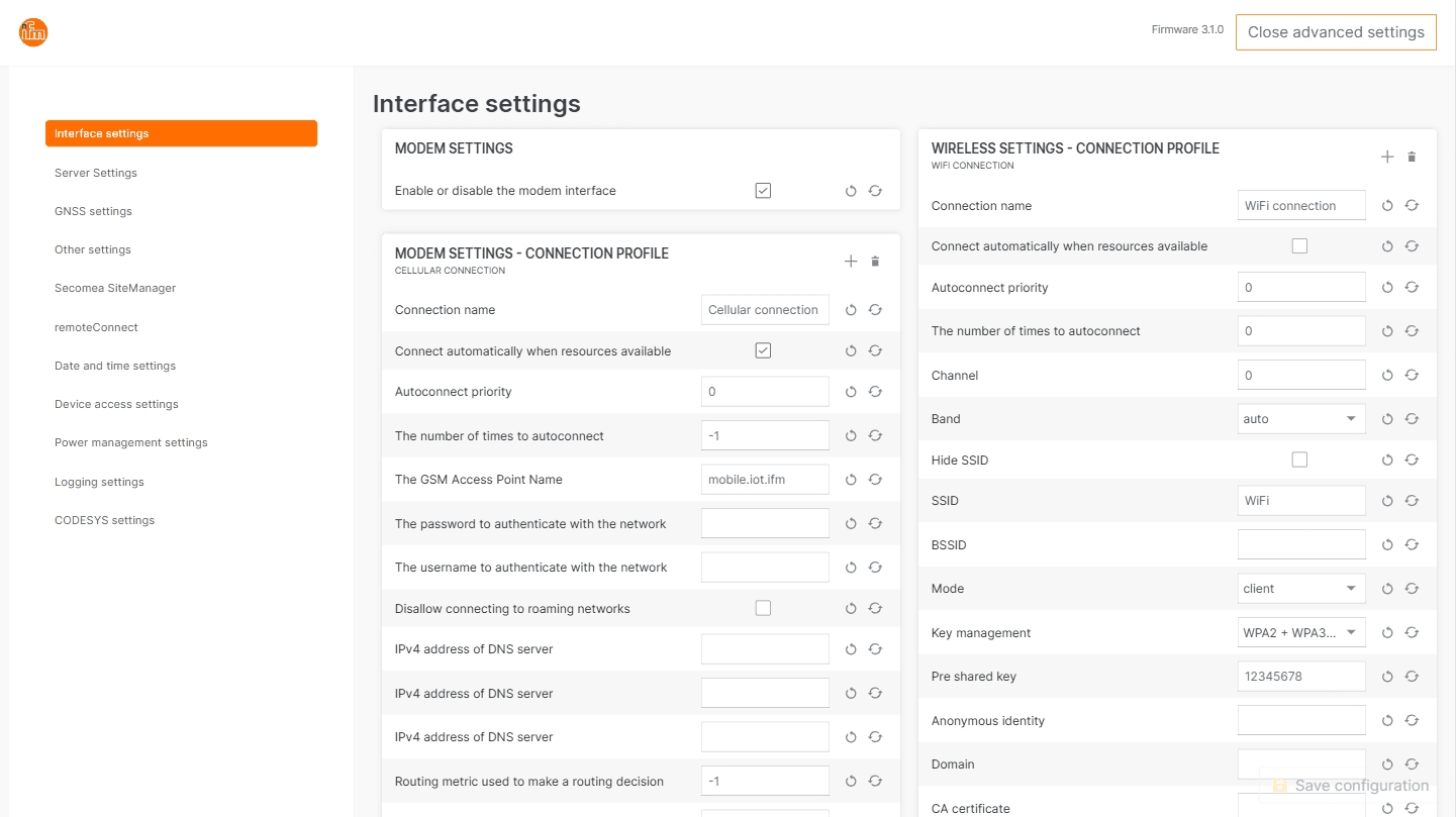 The cellular modem settings allow users to manage mobile broadband connectivity, including SIM settings, network selection, and APN configuration. The Ethernet interface can be set up for LAN or WAN roles, with options for static IP or DHCP configuration. The Wi-Fi interface supports both client and access point modes, enabling flexible wireless connectivity.